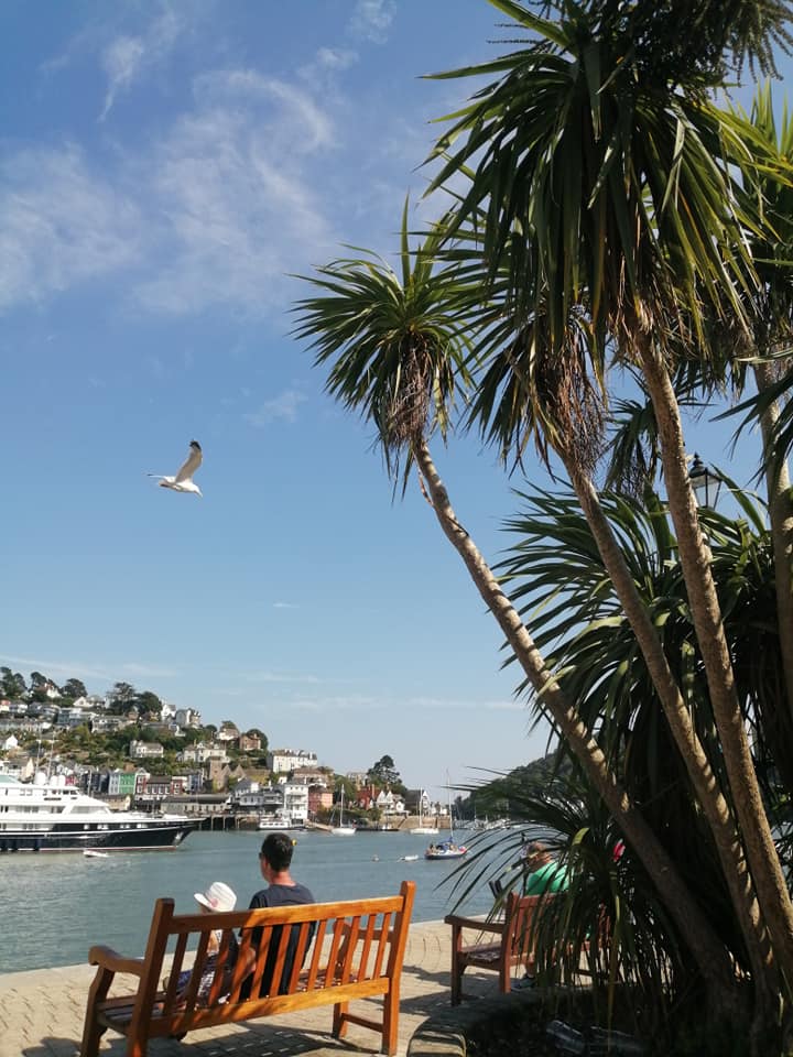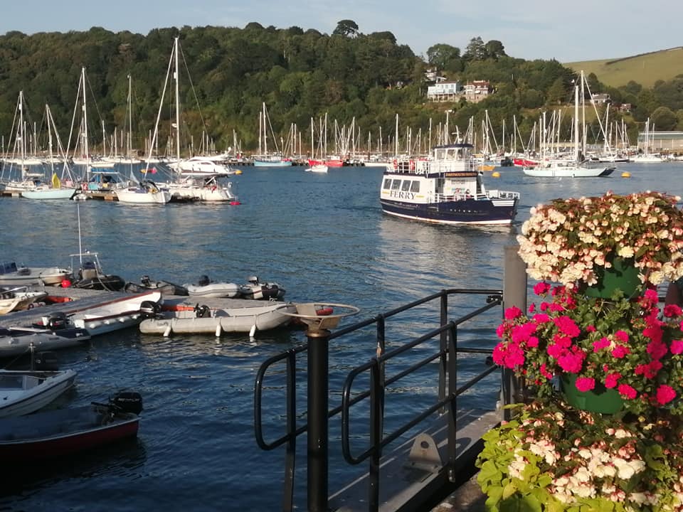 Sit down on a bench to gaze at the boats underneath the swaying palm-trees. The bustling ‘Dart ‘Harbour bursts with life as fishing vessels bring in fresh hauls fresh from the English Channel, tourists pile on and off ferries, boats moor in and there are gleaming yachts and cruise boats alongside Dartmouth town jetty and Naval vessels parked in the Marina. All the while, the higher and lower ferries transport people and vehicles across the Dart. The harbour is lined with colourful pennants attached to the barricades, all handcrafted by local people and visitors from all over the world to commemorate the 400th anniversary of the Mayflower sailing from Dartmouth. Across the Dart is the green backdrop of Kingswear where steam trains occasionally weave in and out.